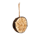 De kokosnoot is gebruiksklaar en kan eenvoudig worden opgehangen aan een boom of schutting.