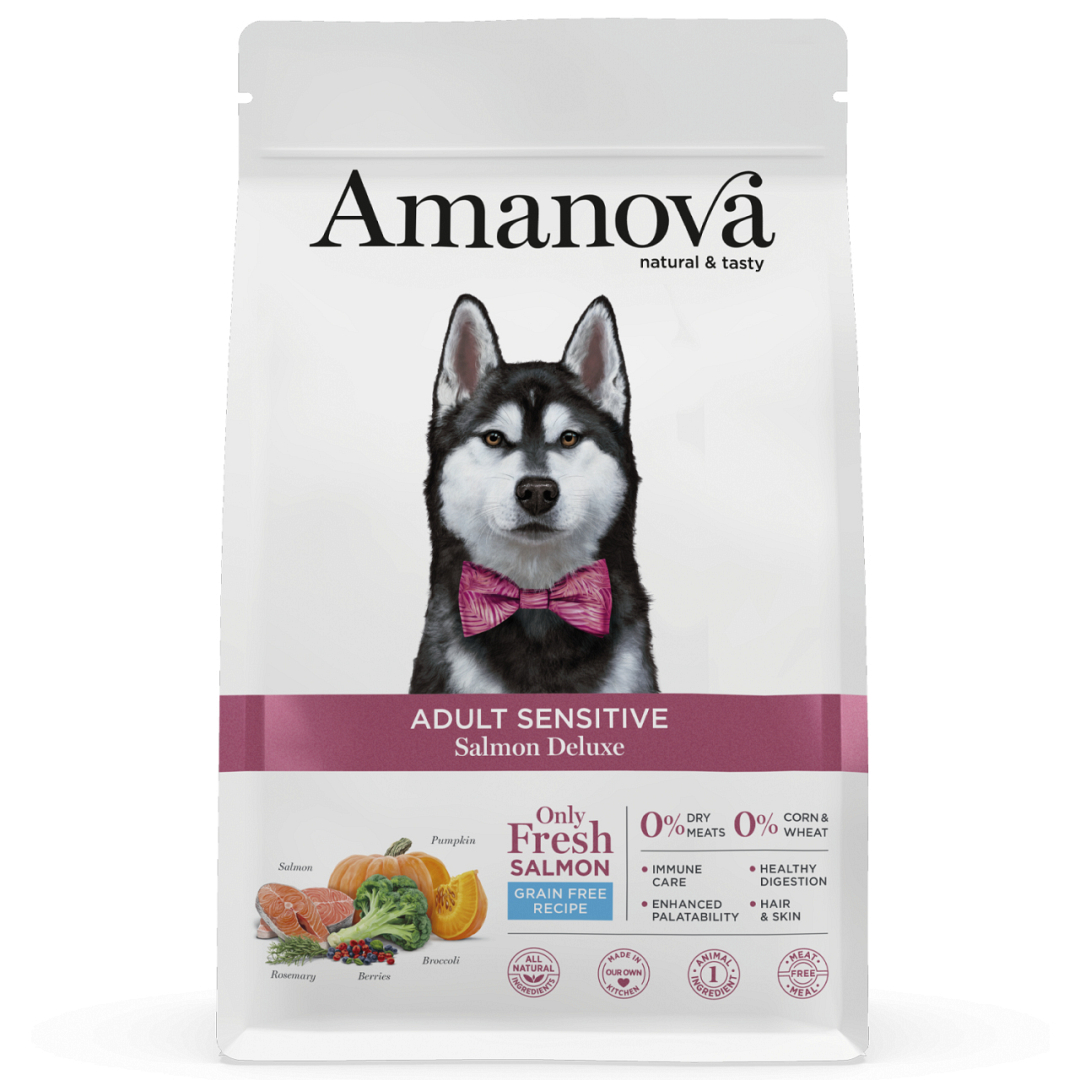 Amanova Adult Salmon Deluxe hondenvoer is een heerlijke, zorgvuldig samengestelde maaltijd voor volwassen honden met een gevoelige huid of spijsvertering. Deze super premium hondenvoeding is hypoallergeen, bevat geen granen en is bereid met uitsluitend verse en smaakvolle zalm.