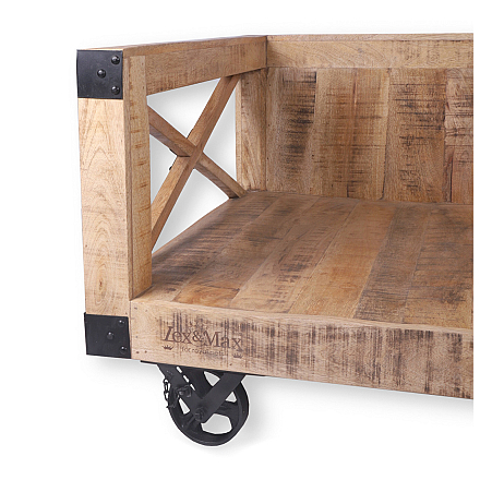 • De divan is gemaakt van mangohout en afgewerkt met metalen wielen en metalen decoratie. Twee wielen van de vier zijn te blokkeren middels een metalen pen.