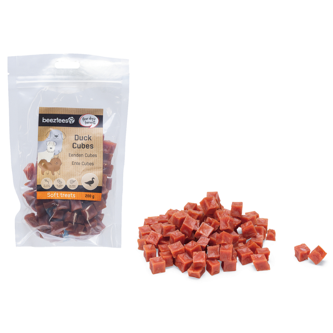 Beloon jouw hond eenvoudig met deze Beeztees hondensnack eenden cubes. Deze hondensnacks met overheerlijke eendsmaak zijn klein van stuk en daardoor ideaal om te gebruiken tijdens het trainen van jouw hond. Het compacte formaat zorgt er bovendien voor dat je de beloningssnack gemakkelijk kunt meenemen in je jaszak of beloningstasje.
