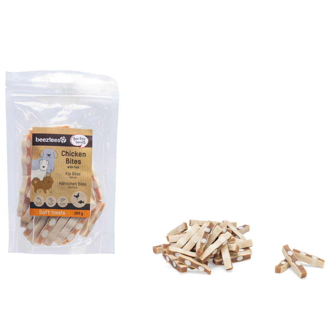De Beeztees kip bites met zijn heerlijke hondensnacks. Deze zachte snacks zijn een perfecte beloning of tussendoortje voor jouw hond.