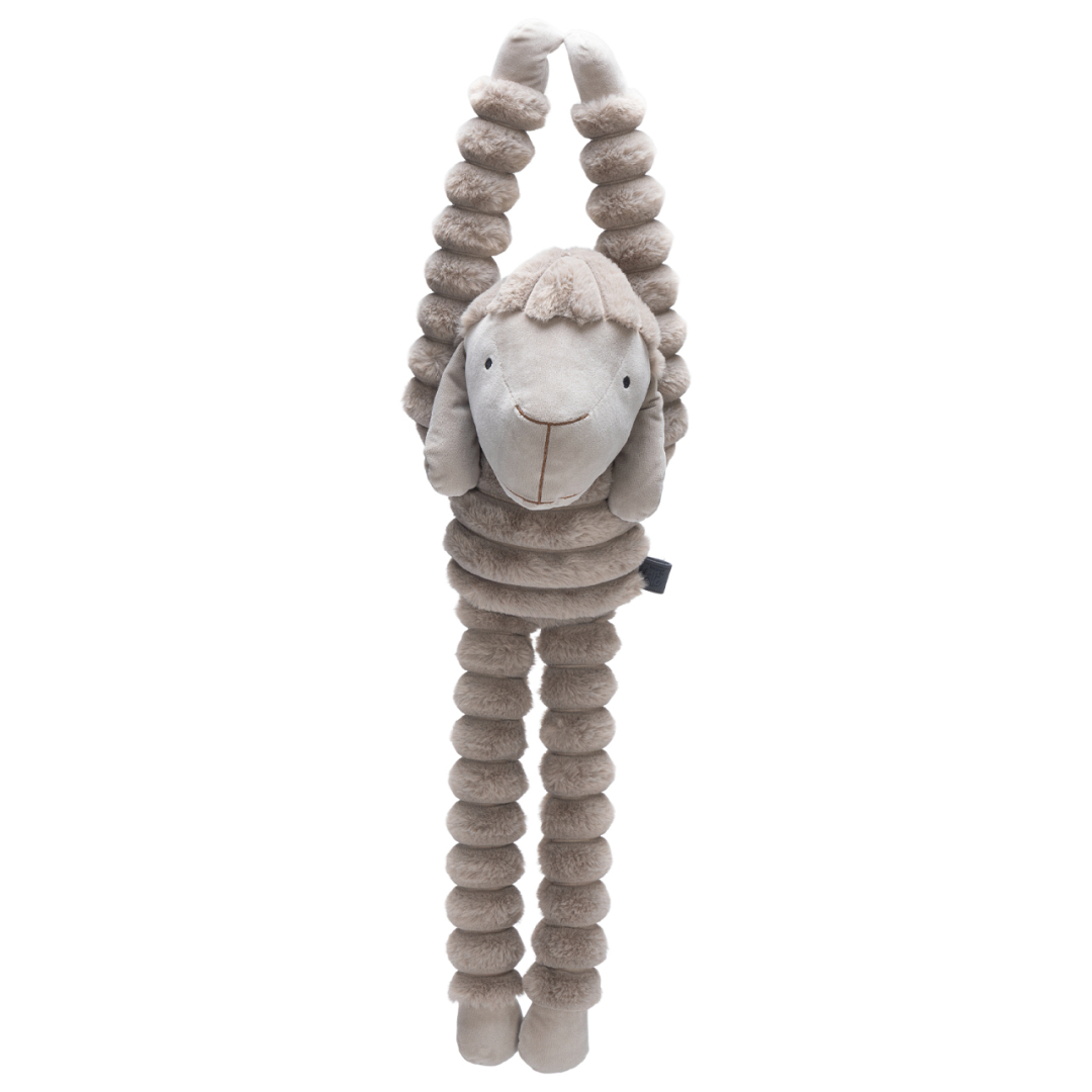 De Designed by Lotte Reza hang schaap is een grote hondenknuffel met lange armen en benen, perfect om mee te knuffelen en spelen. Dit zachte schaap is gemaakt van een combinatie van pluche en ribstof, wat dit hondenspeelgoed extra fijn maakt voor honden die graag kroelen.