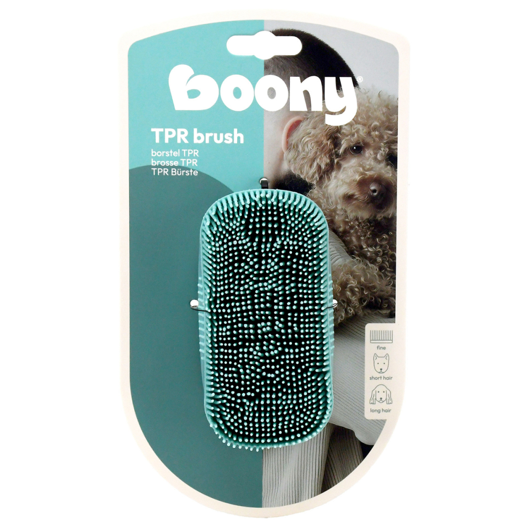 Deze TPR hondenborstel van Boony is speciaal ontwikkeld voor honden met een gevoelige huid en vacht. Dankzij de zeer fijne TPR-sprietjes borstel je op een milde, doeltreffende manier, zonder de huid te irriteren. Ideaal voor dagelijkse verzorging en perfect te gebruiken tijdens het wassen van je hond.