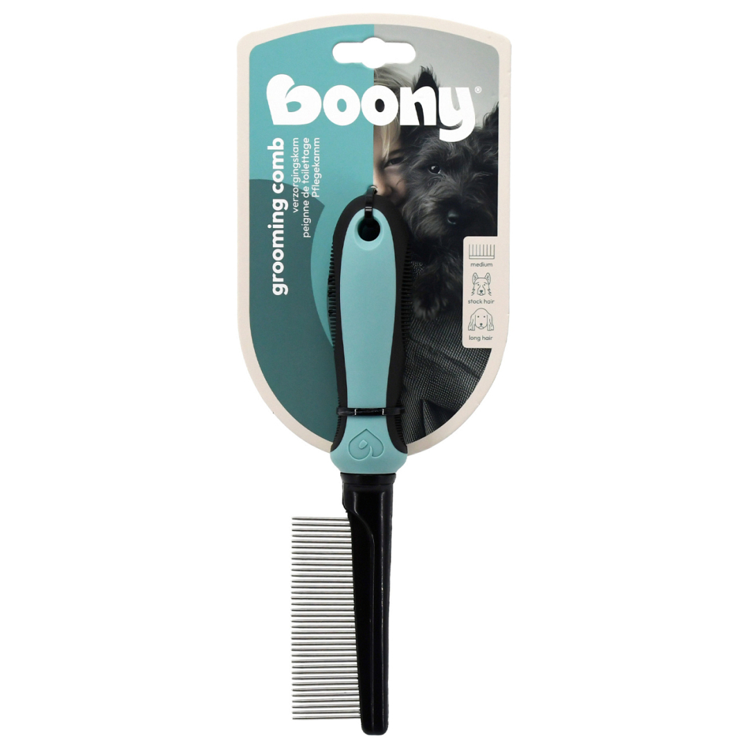 Deze Boony Verzorgingskam met gemiddelde tandwijdte is ideaal voor honden met een stockharige of lange vacht. Door de vacht los te maken tijdens het kammen, verwijder je eenvoudig losse haren, vuil en lichte klitten. Zo zorg je op een doeltreffende manier voor een frisse, goed onderhouden vacht.
