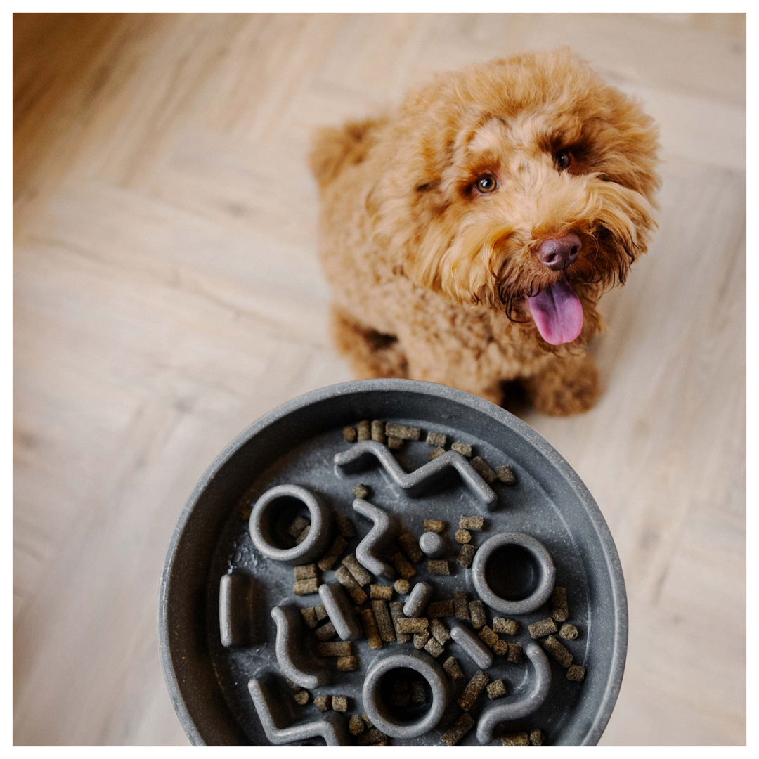 De stijlvolle en praktische District 70 Slow Feeder biedt een manier om jouw hond langzamer te laten eten. Heeft jouw hond zijn maaltijd al op voordat je het weet? En moet hij of zij vervolgens braken? Het schrokken van eten kan gezondheidsnadelen met zich meebrengen, zoals de kans op overgewicht of zelfs een maagtorsie.