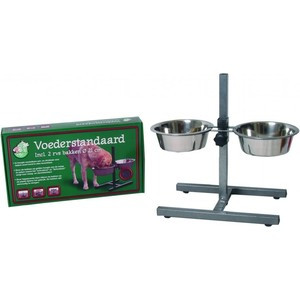 In hoogte verstelbare standaard voor twee voerbakken. Voorzien van noppen aan de onderzijde tegen roestvorming.