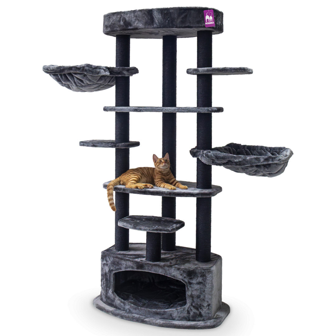 Krabpaal Alexandra 177 is gemaakt voor katten die graag klimmen, krabben en springen. Want dat kan allemaal in deze toffe krabpaal. De hoge sisalstammen nodigen uit om lekker aan te krabben en de plateaus zijn om op te klimmen en springen. Dit hoge krabmeubel is zacht en heeft een dikke bodemplaat. Helemaal bovenin staat een fijne loungemand klaar voor katten die alles in de gaten willen houden en het slaaphuisje onderin is ideaal voor katten die zich graag even terugtrekken.