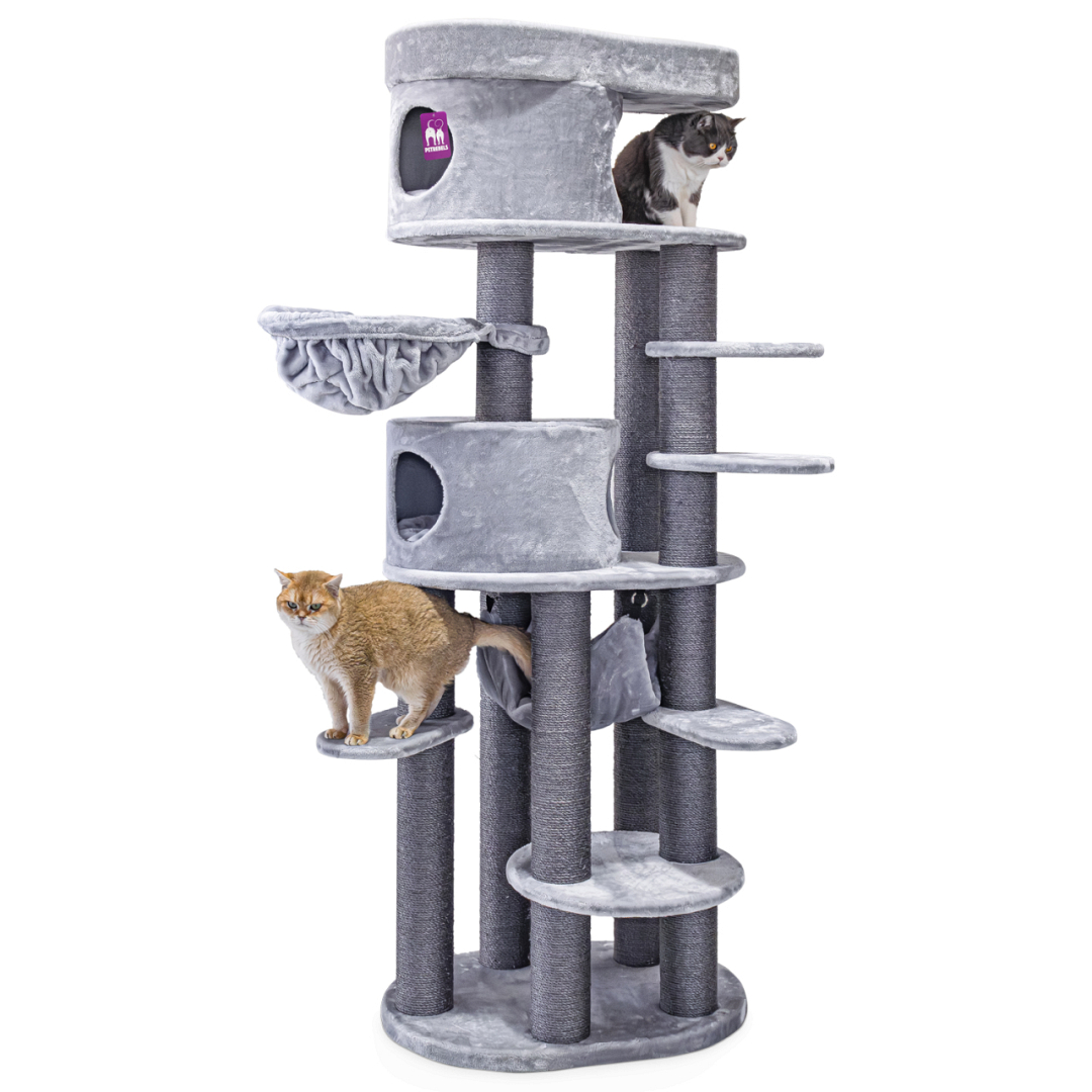 Luxe extra hoog krabmeubel met twee knusse slaaphuisjes, een grote hangmat, meerdere plateaus én een XXL loungemand bovenin. Afm. 78 x 58 x 210 cm.