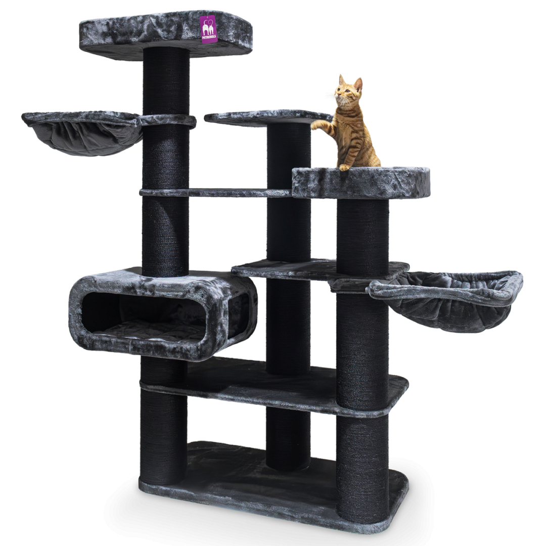 Krabmeubel Bengal 199 is een echte reus. Hij is hoog, superstevig en perfect voor (ras)katten die alles willen: klimmen, krabben, slapen en iedereen in de gaten houden. Deze krabpaal heeft veel dikke krabstammen die volop ruimte geven voor robuust krabwerk. En de dikke plateaus zorgen ervoor dat zelfs zware katten moeiteloos naar boven kunnen klimmen, op weg naar een van de zachte loungemanden, het slaaphuisje of voor een chill-sessie in een van de hangmatten. Eigenlijk is deze krabpaal gewoon ideaal!