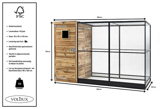 De Voldux Volière Thomas heeft een nachthok van geïmpregneerd hout en een vlucht van aluminium. Hierdoor is deze vogelkooi onderhoudsvrij en biedt hij een ruime levensduur van 10 tot 15 jaar. De totale (buiten) afmeting van deze aluminium volière is 289 x 120 x 190 cm, waardoor hij geschikt is voor de huisvesting van meerdere vogels.